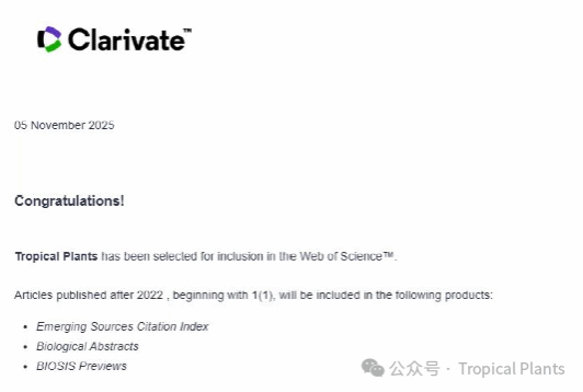 2025年11月,由海南大学主办的英文国际期刊《热带植物(英文)》(Tropical Plants),顺利通过了科睿唯安(Clarivate Analytics)的评估,正式被Emerging Sources Citation Index(ESCI)数据库收录。ESCI数据库将完整回溯并检索Tropical Plants自创刊以来所有已发表的论文,文章可以被Web of Science平台索引,这一进展将显著提升期刊论文的国际可见度与学术传播力,为全球作者构建更广阔的学术交流平台,进一步增强国际学术影响力。